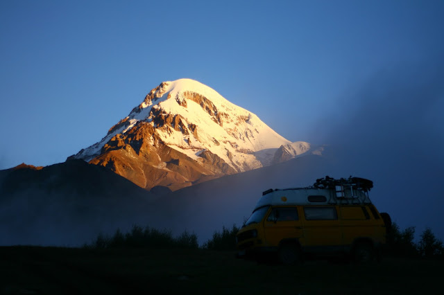 Early the next morning we started to mount Aragats (not to be mixed up with Ararat). A road leads up to 3200m to a lake, which is a good starting point for a tour to the summit. We drove by the ruins of a passenger bus – which was obviously given a second life as target for a well-hidden shooting range - , a lot of cows of course and some shepherds camps until we arrived at the “Hotel and Restaurant Aragats” . Up there, Andi and Franks DAF Leyland truck parked in front. We knew them already from Göreme, had met them again in Tbilisi and we knew they had planned almost the same route as we did. So this was a nice coincidence and we strolled around together a bit, curious about the strange buildings scattered around the mountain. Some looked like huge parking garages, others rather reminded of starlings boxes with tons of cables coming out. Later we found an article about this old soviet cosmic ray research center (http://www.ftd.de/wissen/: